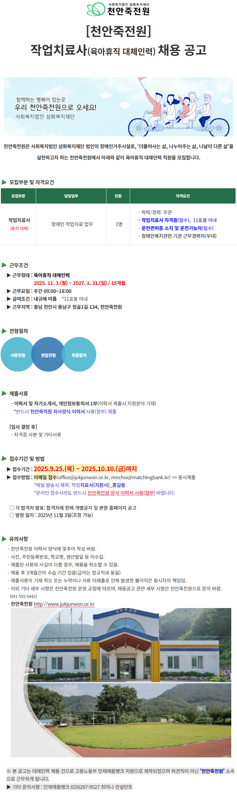 [천안죽전원] 작업치료사(육아휴직 대체인력) 채용 공고