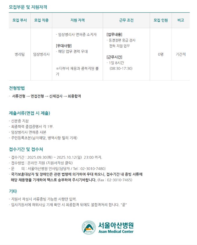 서울아산병원 채용 : 병리팀 임상병리사 채용 - 인크루트 채용정보