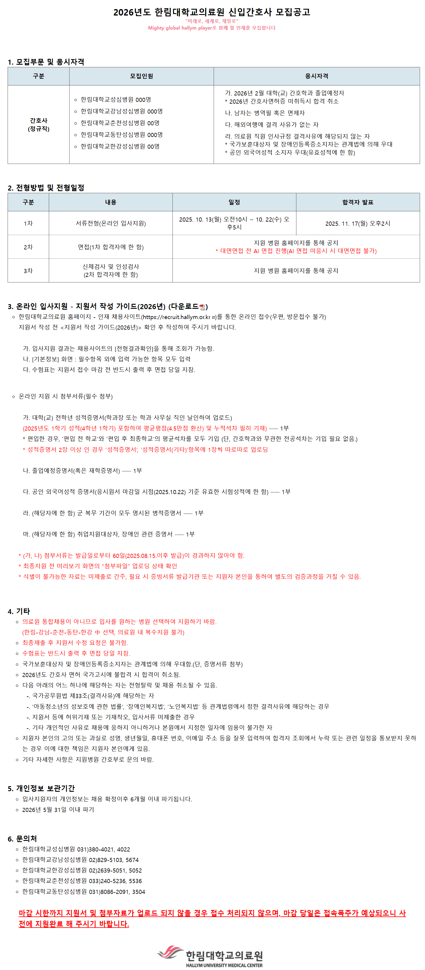 2026년도 한림대학교의료원 신입간호사 모집공고