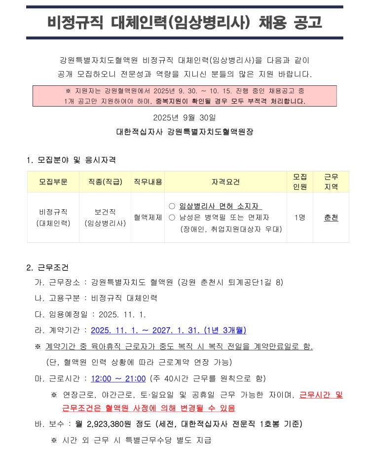 [강원혈액원] 2025년 비정규직 대체인력(임상병리사) 채용공고
