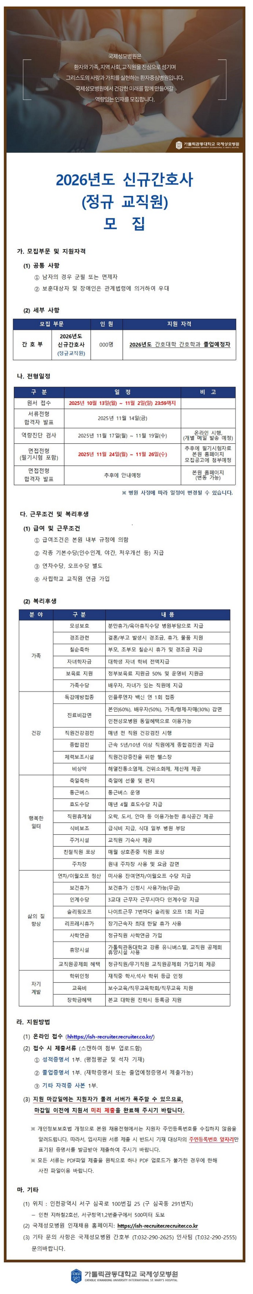 국제성모병원 2026년도 간호부 신규간호사 (정규교직원) 모집
