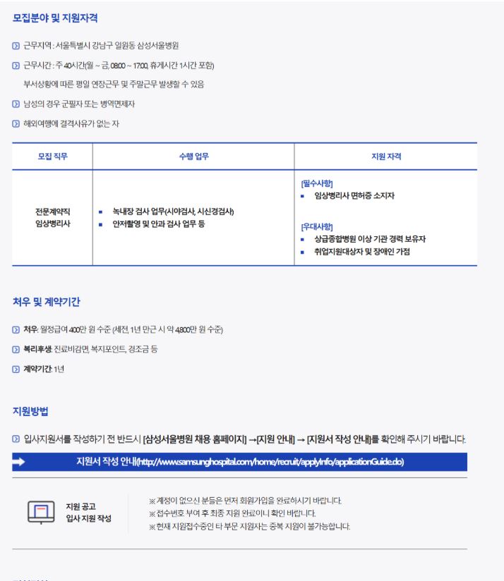 삼성서울병원 안과검사실 계약직 임상병리사 채용