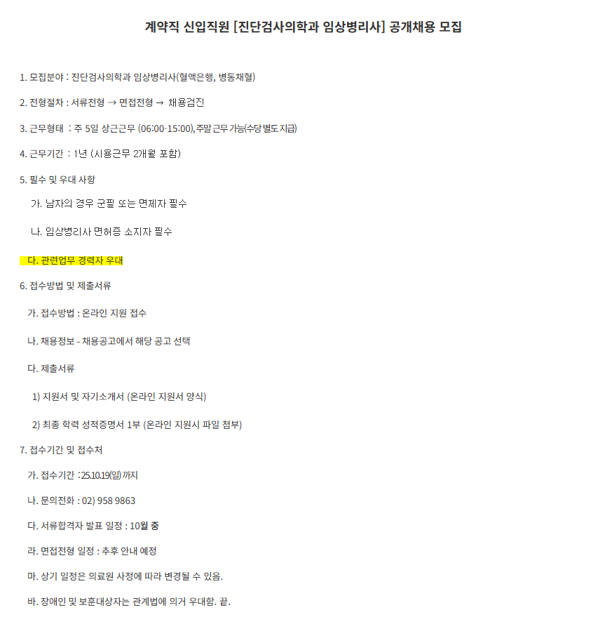 경희의료원 계약직 신입직원 [진단검사의학과 임상병리사] 공개채용 모집공고