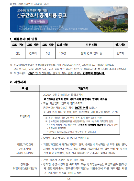 [한국원자력의학원] 2026 한국원자력의학원 신규간호사 공개채용 공고