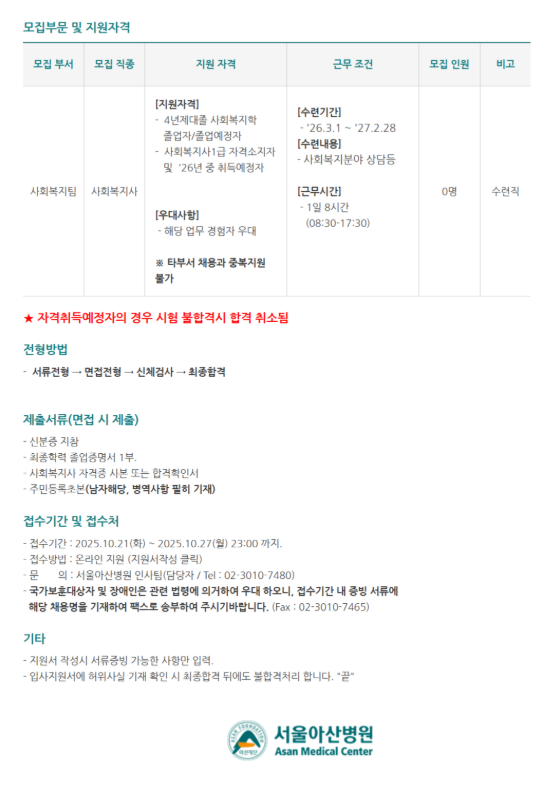 서울아산 병원 2026년 사회복지팀 사회복지사(인턴사원) 모집