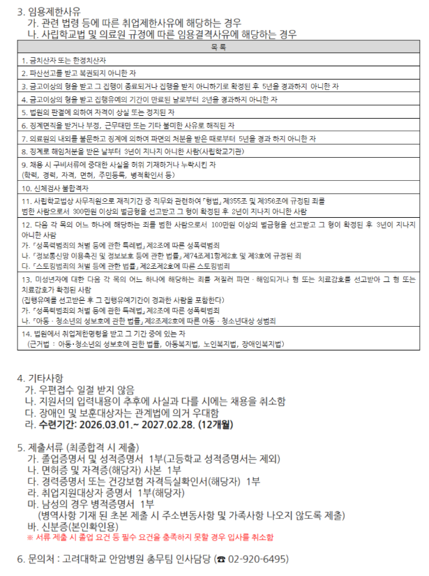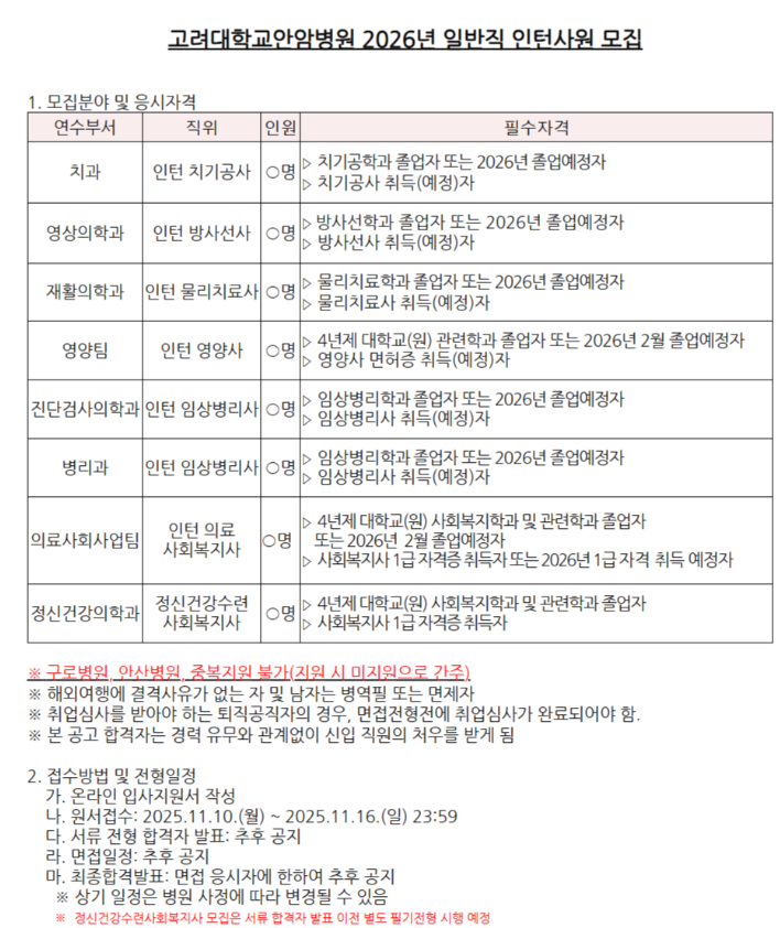 [안암병원]고려대학교안암병원 2026년 일반직 인턴사원 모집