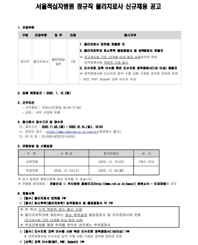 [대한적십자사 서울적십자병원] 물리치료사 신규채용 공고_ 정규직