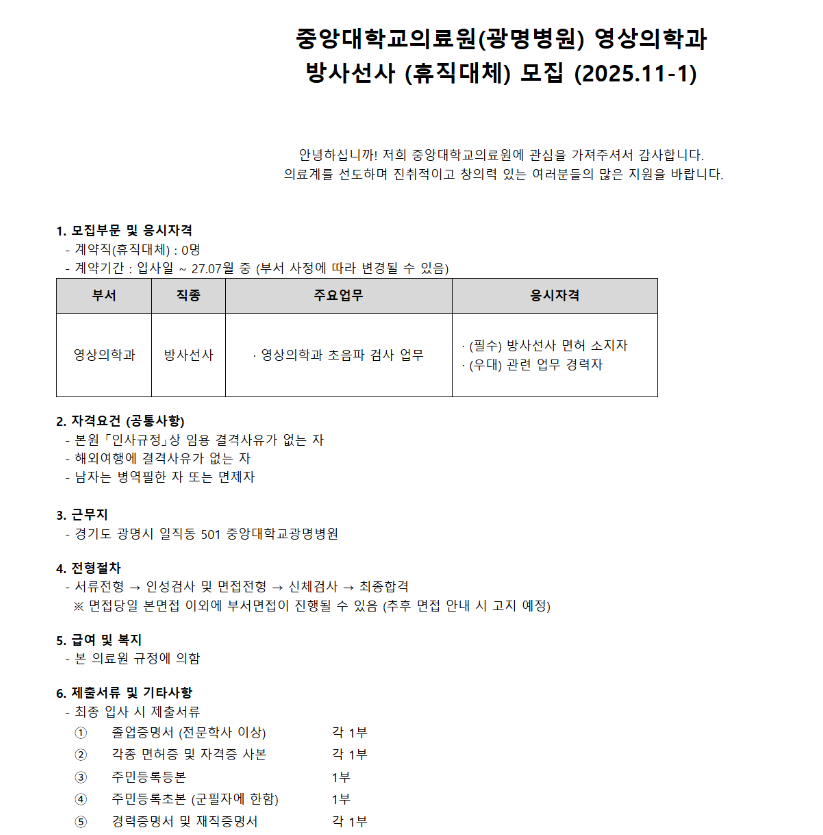 [중앙대학교병원, 광명병원] 영상의학과 방사선사(휴직대체_