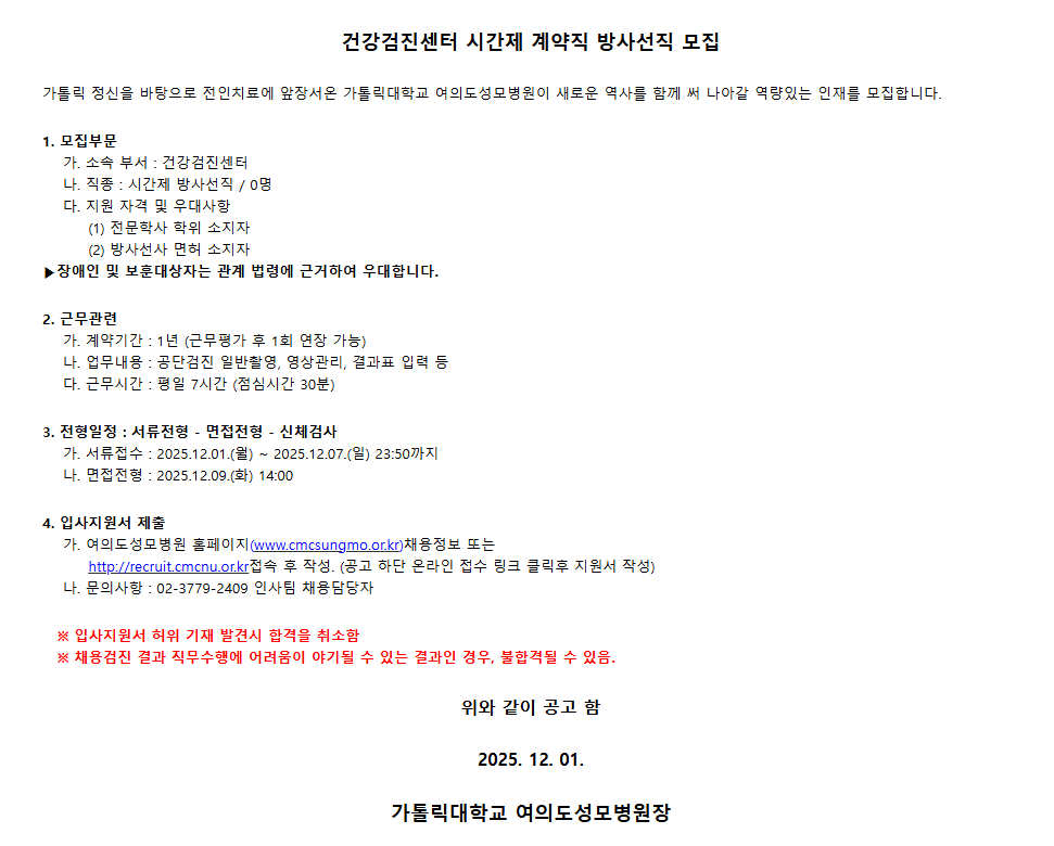 [여의도성모] 건강검진팀 시간제 계약직 방사선직 모집