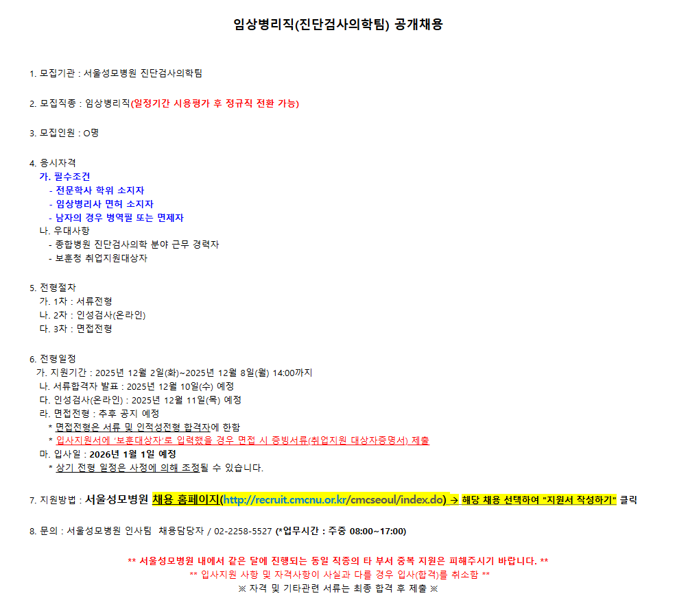 [서울성모] 임상병리직(진단검사의학팀) 공개채용