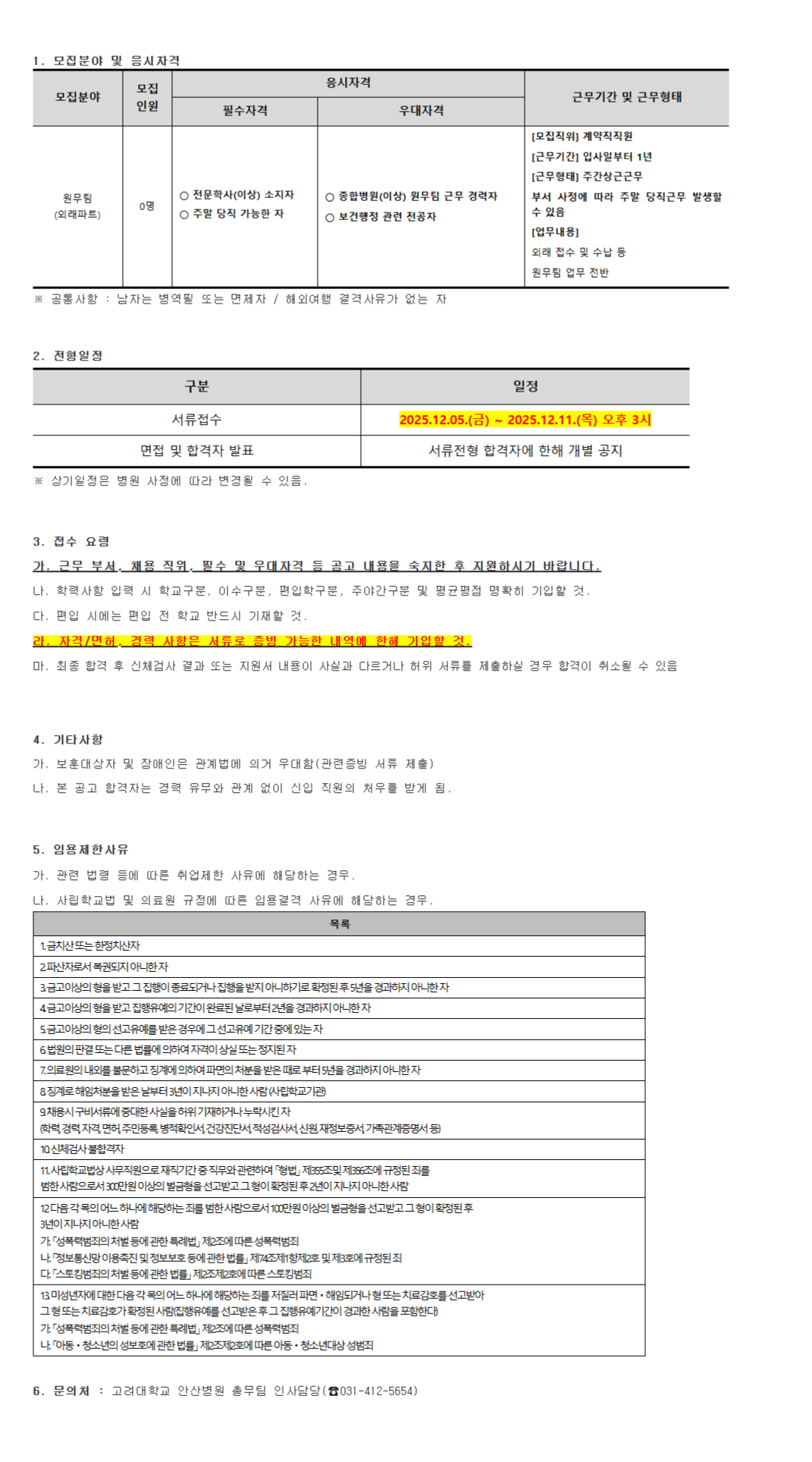 고려대부속안산병원 원무팀(외래파트) 계약직 직원 모집