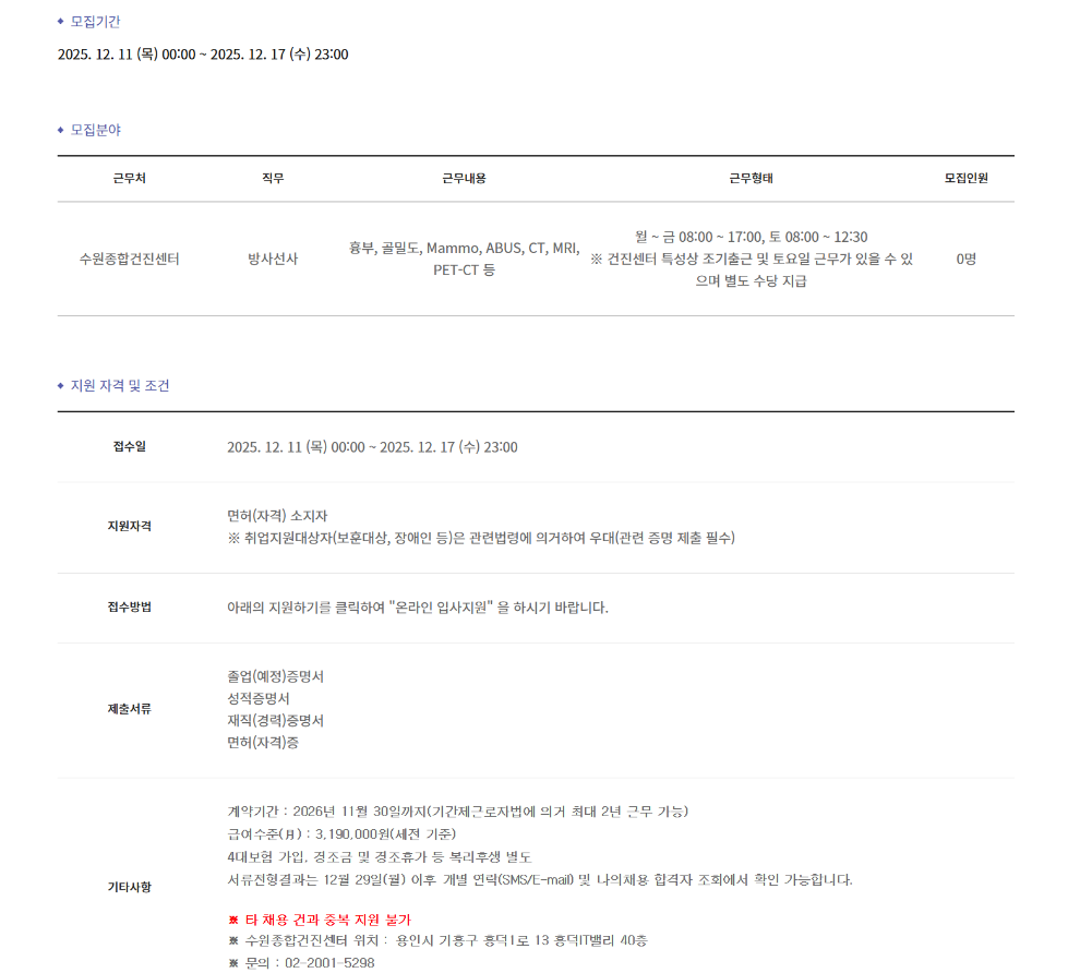 [서울성모]보건의료정보관리직(영상의학팀/계약직) 공개채용
