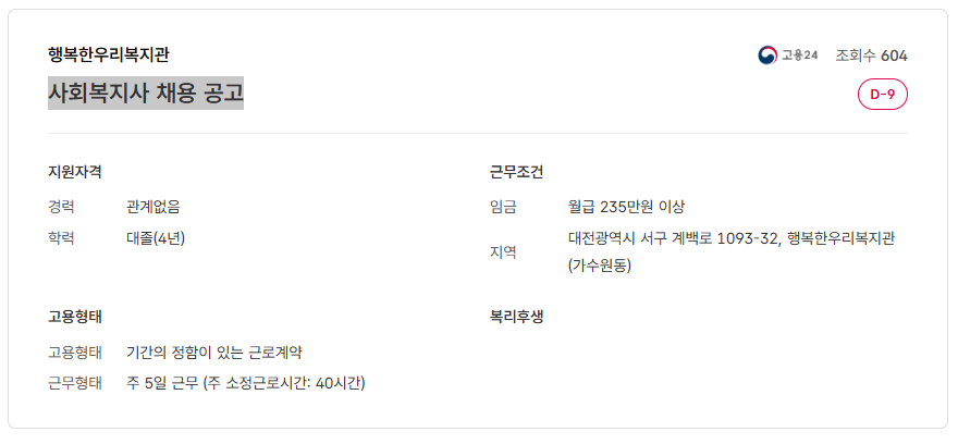 행복한우리복지관 사회복지사 채용 공고(대전)