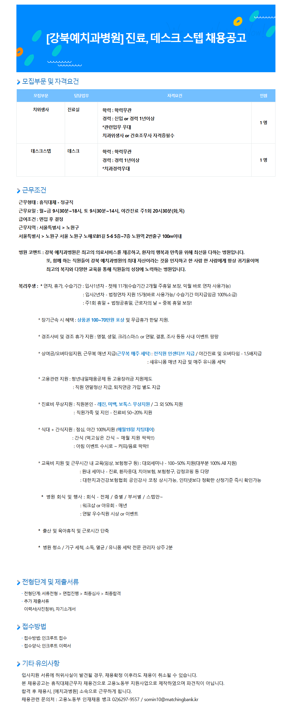 [강북예치과병원] 진료, 데스크 스텝 채용공고