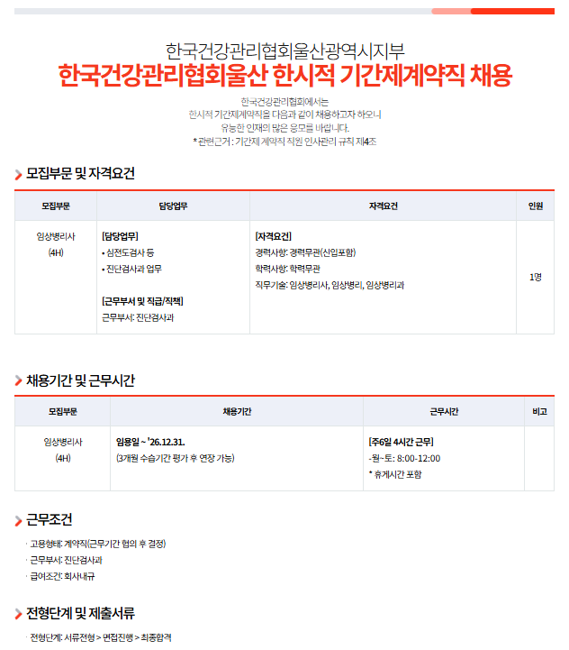 한국건강관리협회울산 한시적 계약직(임상병리) 채용 공고