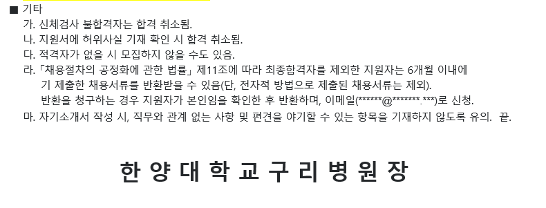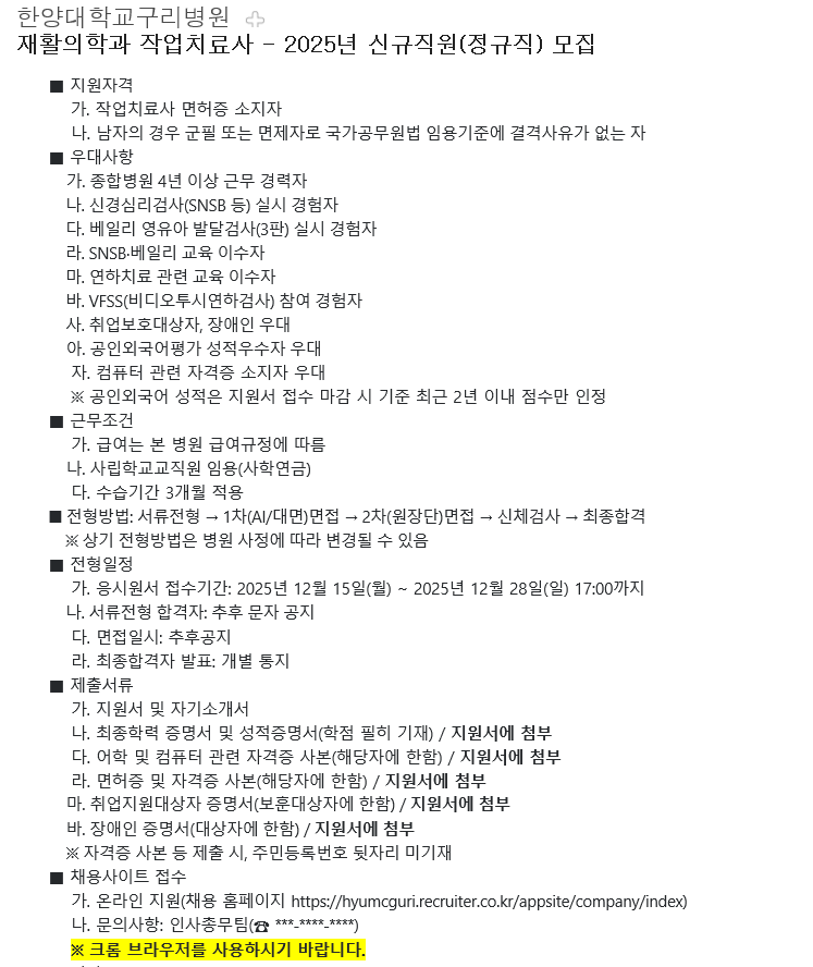 [한양대학교 구리병원] 재활의학과 작업치료사 채용공고