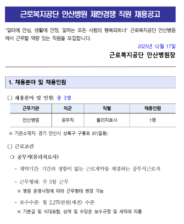 근로복지공단 채용 : [안산병원]공무직(물리치료사)신규채용 - 인크루트 채용정보