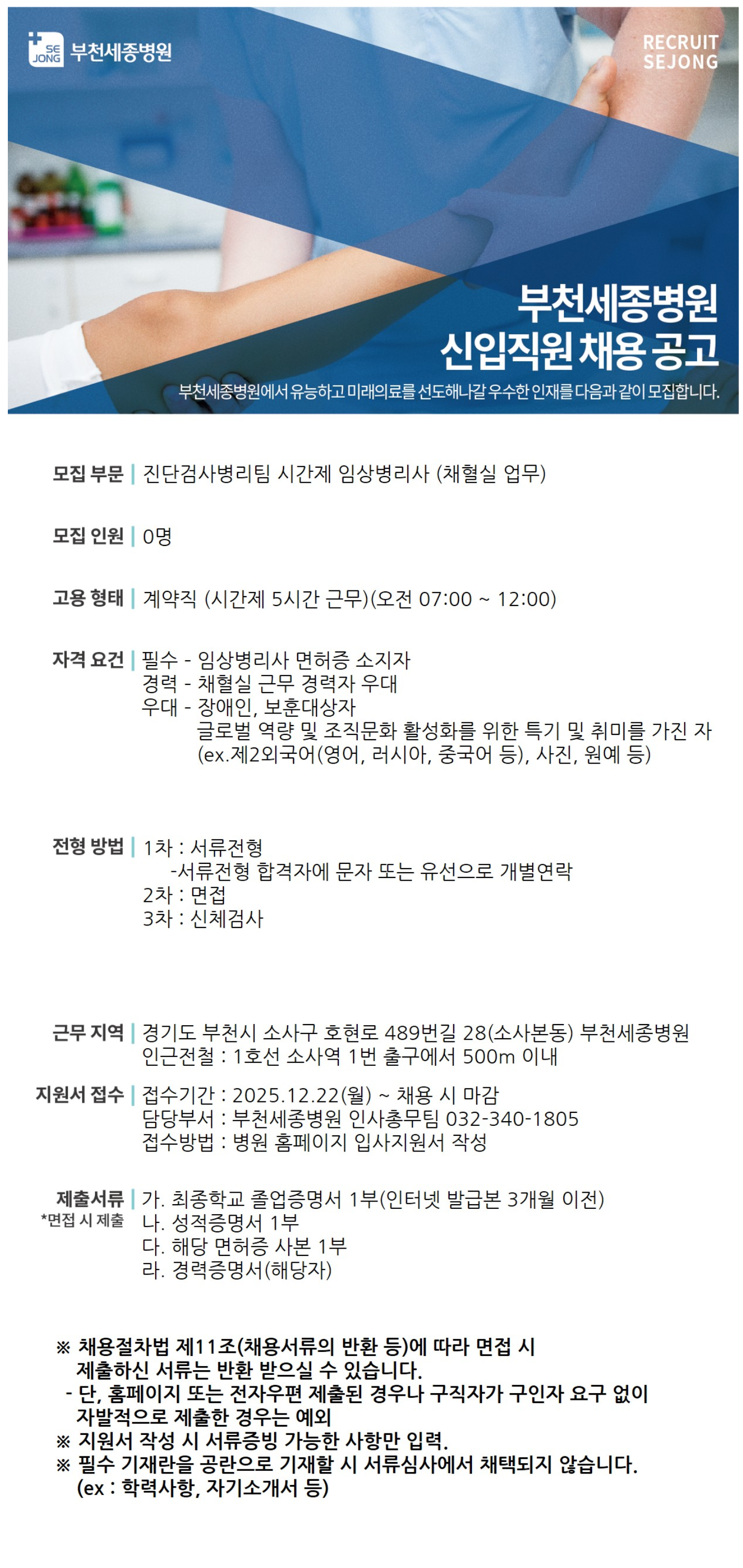 [부천세종병원] 진단검사병리팀 채혈실 임상병리사 채용공고