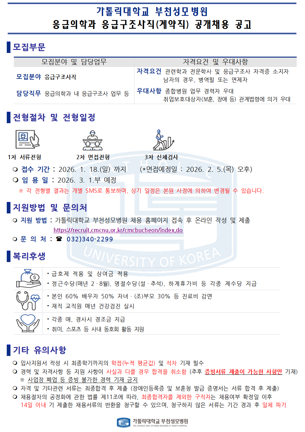 [부천성모] 응급의학과 응급구조사직(계약직) 공개채용 공고
