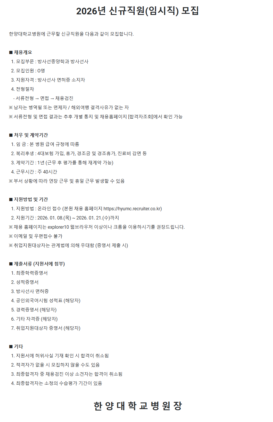 한양대학교병원 방사선종양학과 방사선사 (임시직)