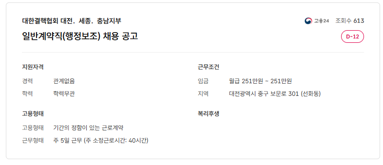 대한결핵협회 대전.세종.충남지부 일반계약직(행정보조) 채용 공고