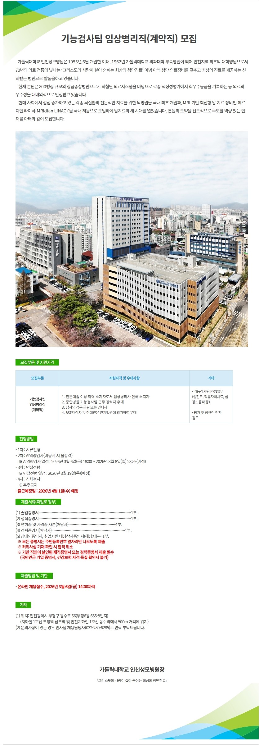인천성모병원 기능검사팀 임상병리직(계약직) 모집