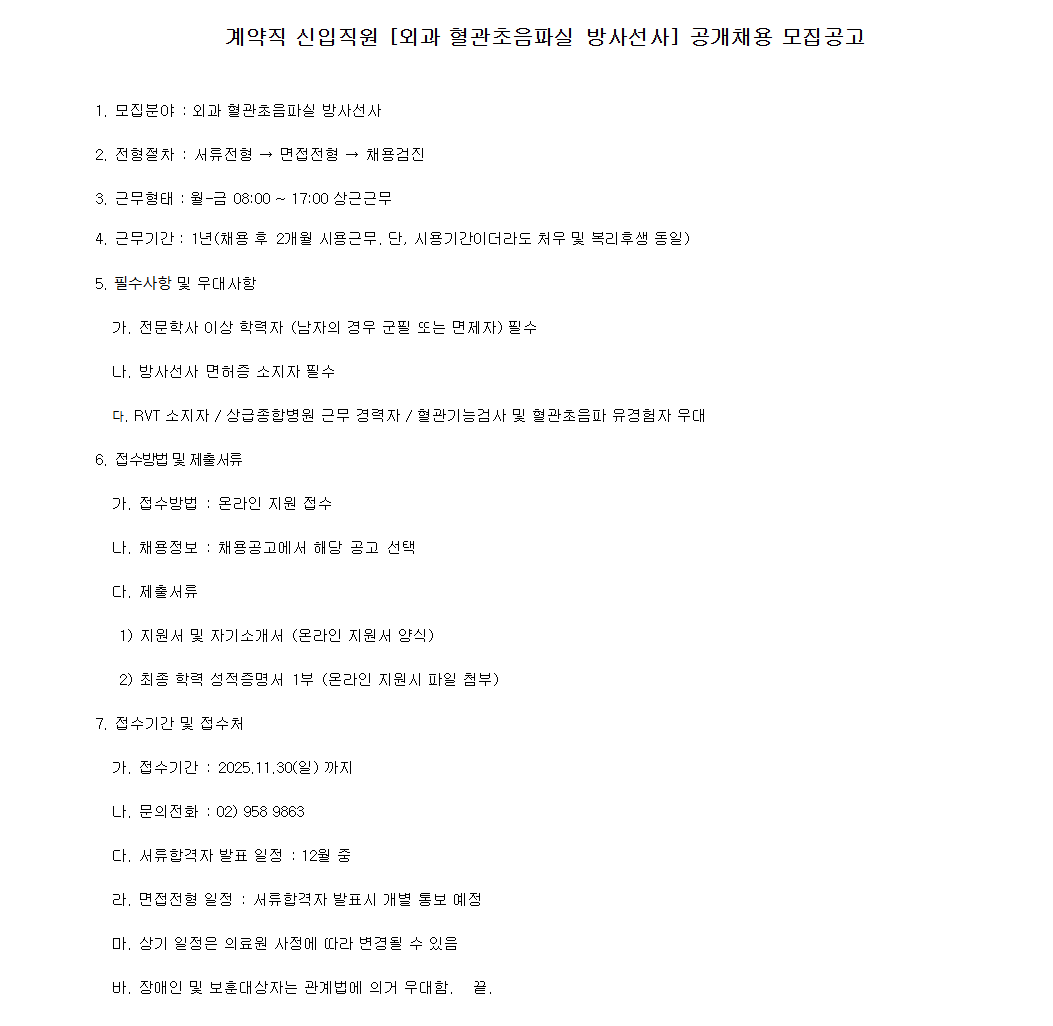 경희의료원 계약직 신입직원 [외과 혈관초음파실 방사선사] 공개채용