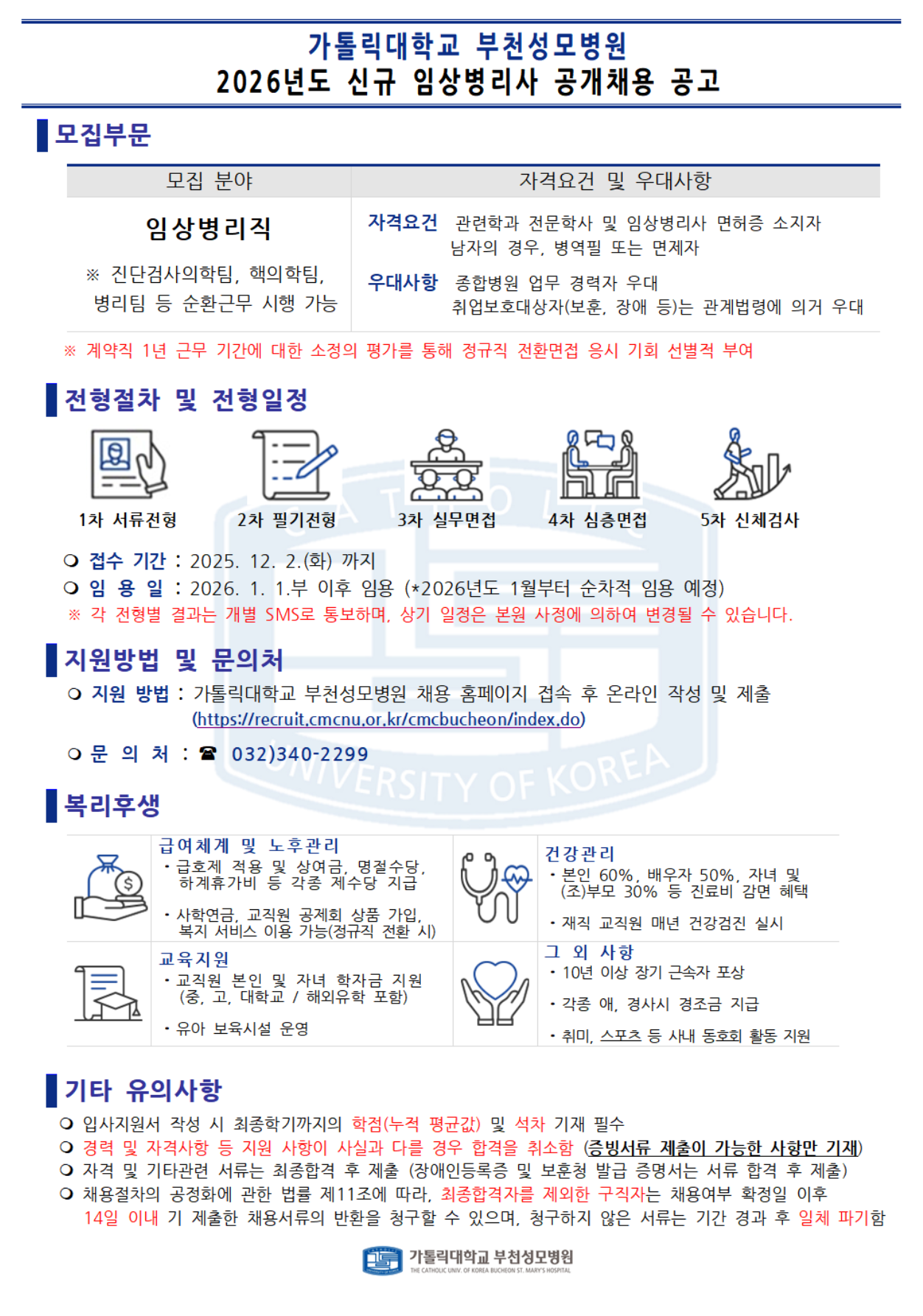 [부천성모] 2026년도 신규 임상병리사 공개채용 공고