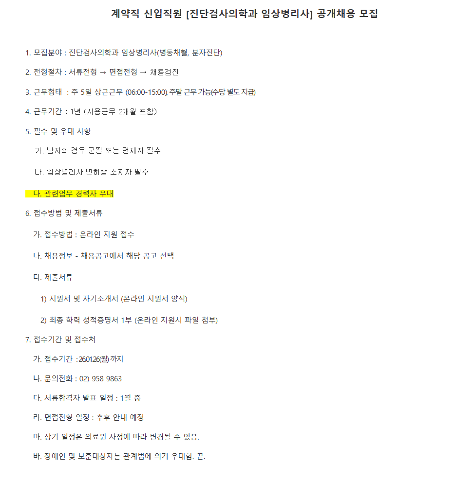 경희의료원 계약직 신입직원 [진단검사의학과 임상병리사] 공개채용 모집공고