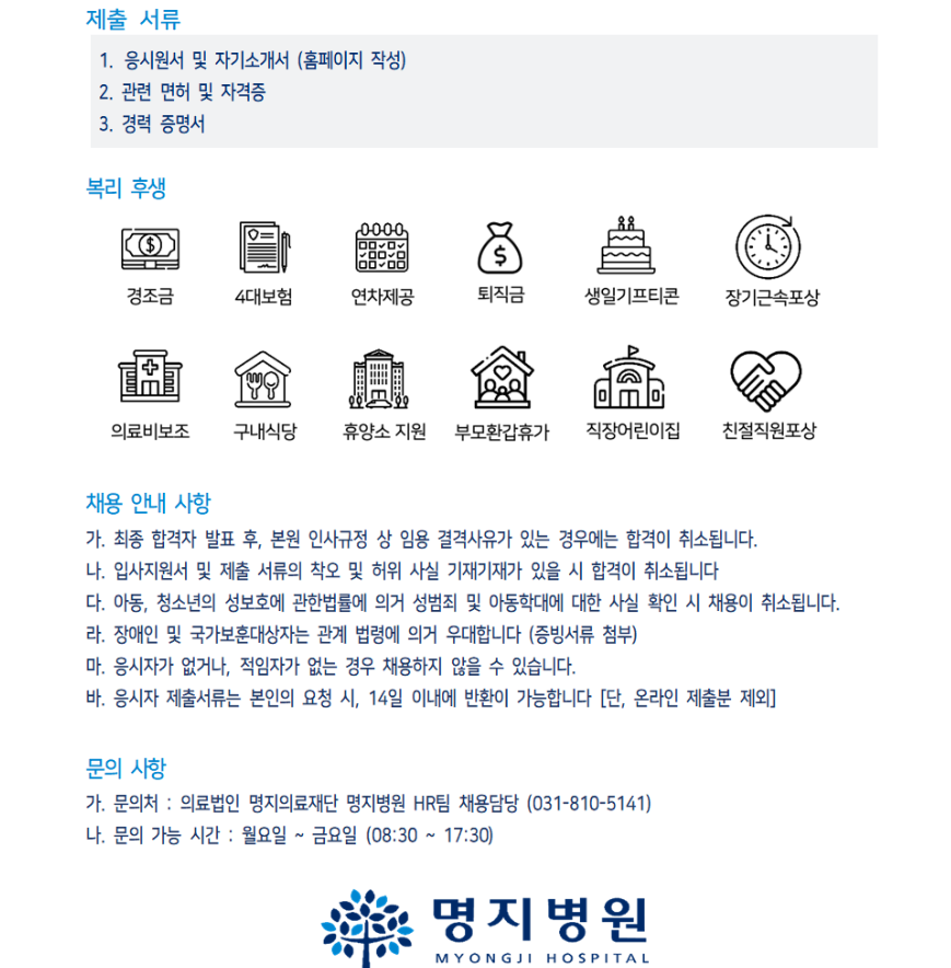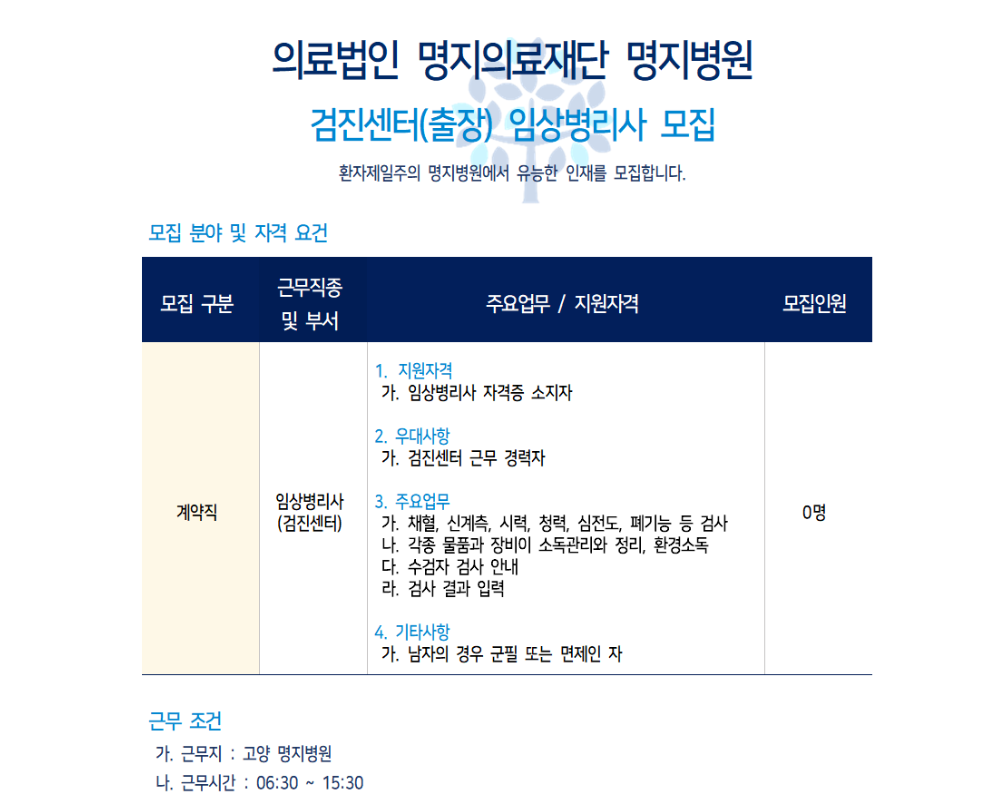 [의료볍인면지의료재단] 검진센터(출장) 임상병리사 모집