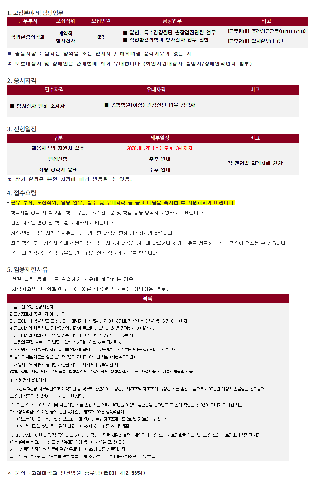 고려대부속안산병원 직업환경의학과 계약직 방사선사 모집