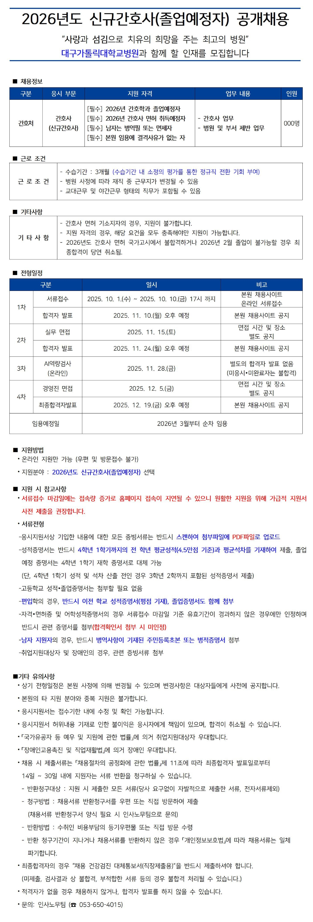 대구가톨릭대학교병원 [간호처] 2026년도 신규간호사(졸업예정자) 공개채용