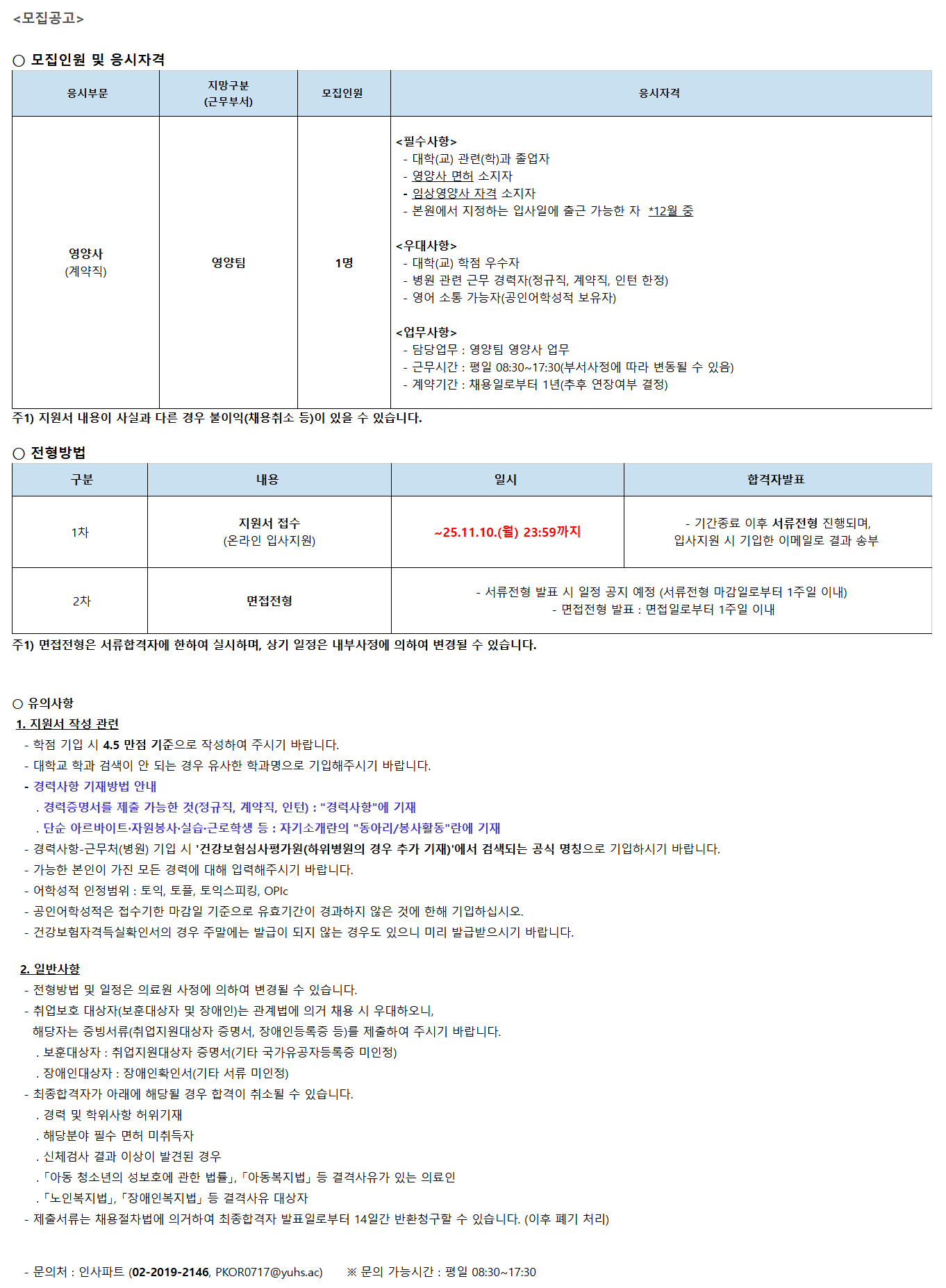 연세대학교의료원 영양사(계약직) 영양팀 모집