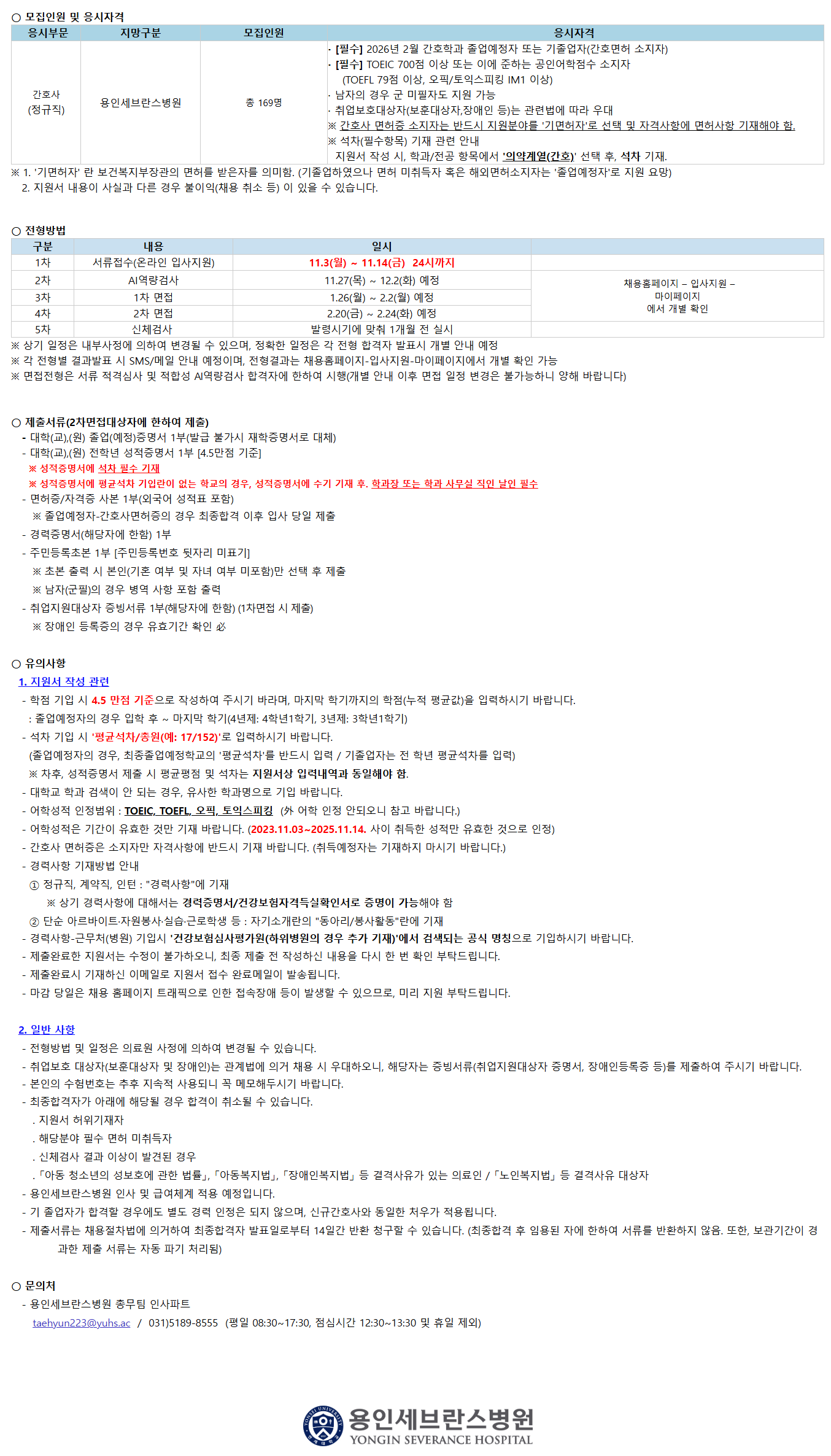 [용인] 2026학년도 용인세브란스병원 신규간호사 모집