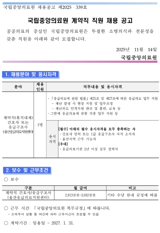 채용공고 사이트: 국립중앙의료원 채용 : 계약직 간호사 또는 응급구조사-휴직대체(울산응급의료지원센터) 채용 공고 - 인크루트 채용정보