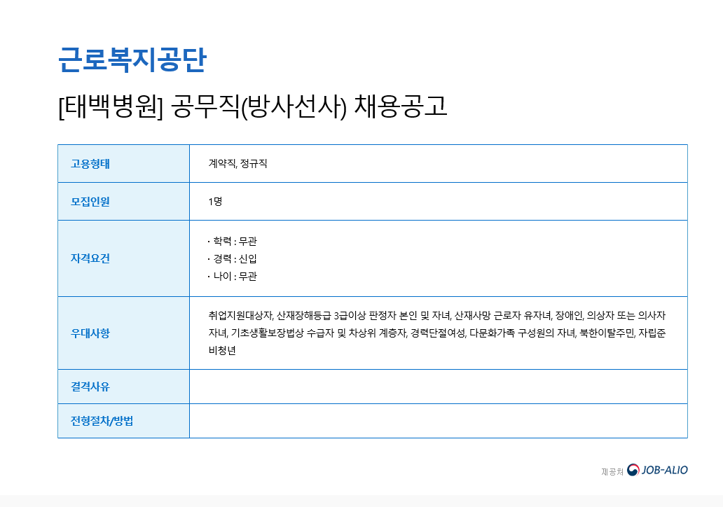 [근로복지공단 태백병원] 곰무직 방사선사 채용공고