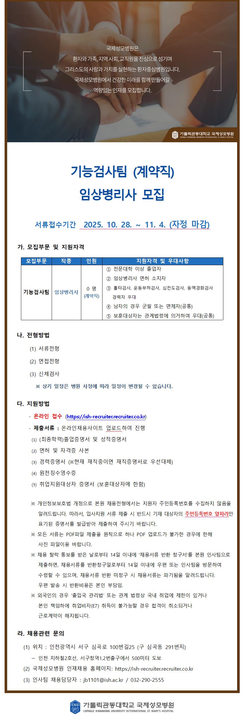 국제성모병원 기능검사팀 (계약직) 임상병리사 모집