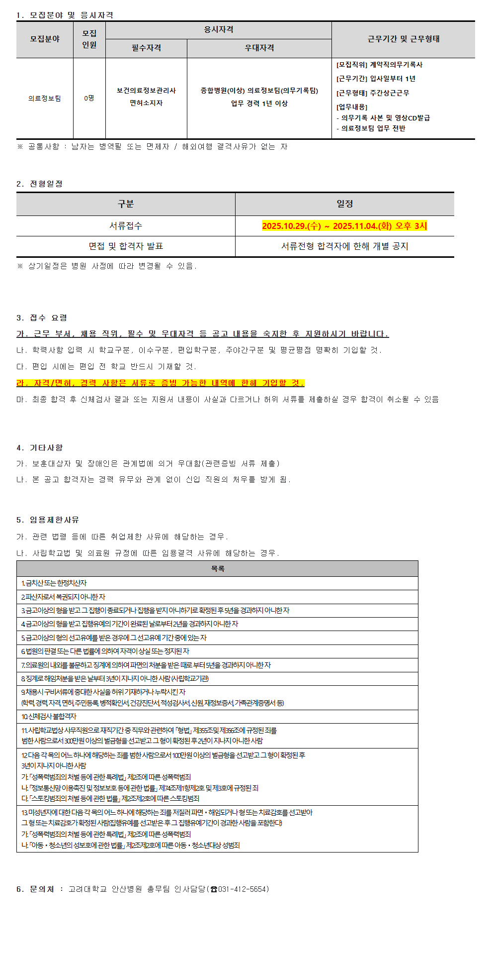 고려대부속안산병원 의료정보팀 계약직 의무기록사 모집