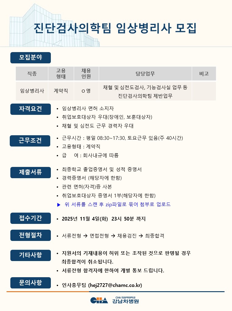 [강남차병원] 진단검사의학팀 임상병리사 모집