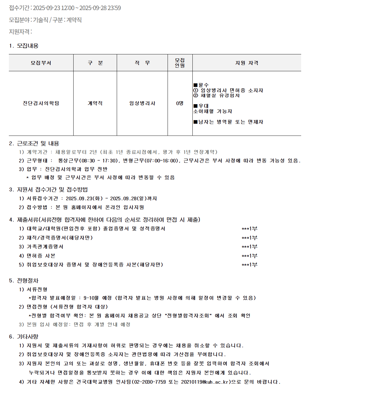 건국대학교병원 [계약직] 진단검사의학팀 임상병리사 채용