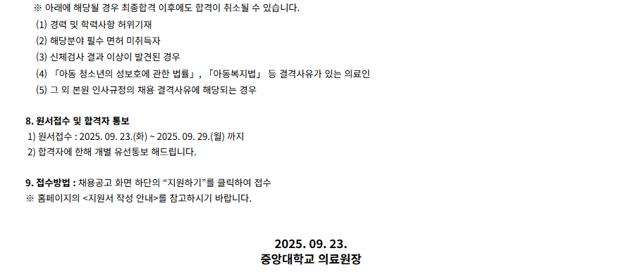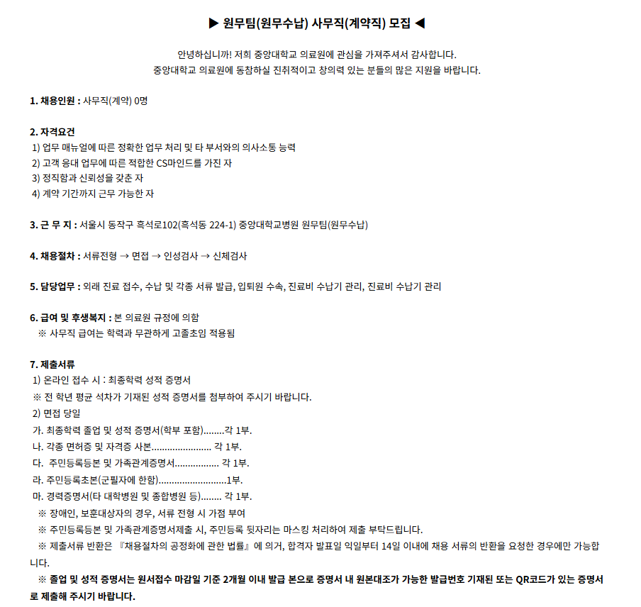 중앙대학교의료원(서울병원) 원무팀(원무수납) 사무직원(계약직) 모집