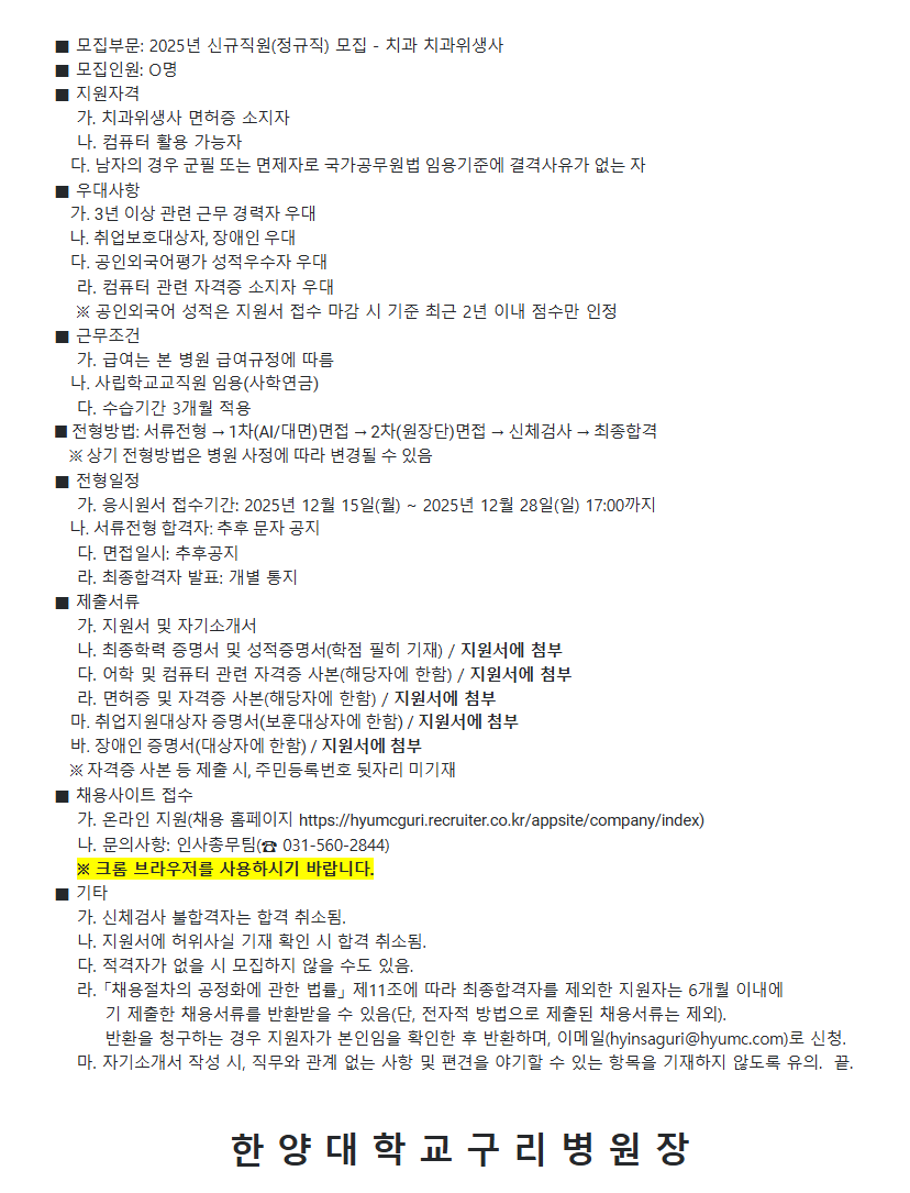 한양대학교구리병원 치과 치과위생사 - 2025년 신규직원(정규직) 모집