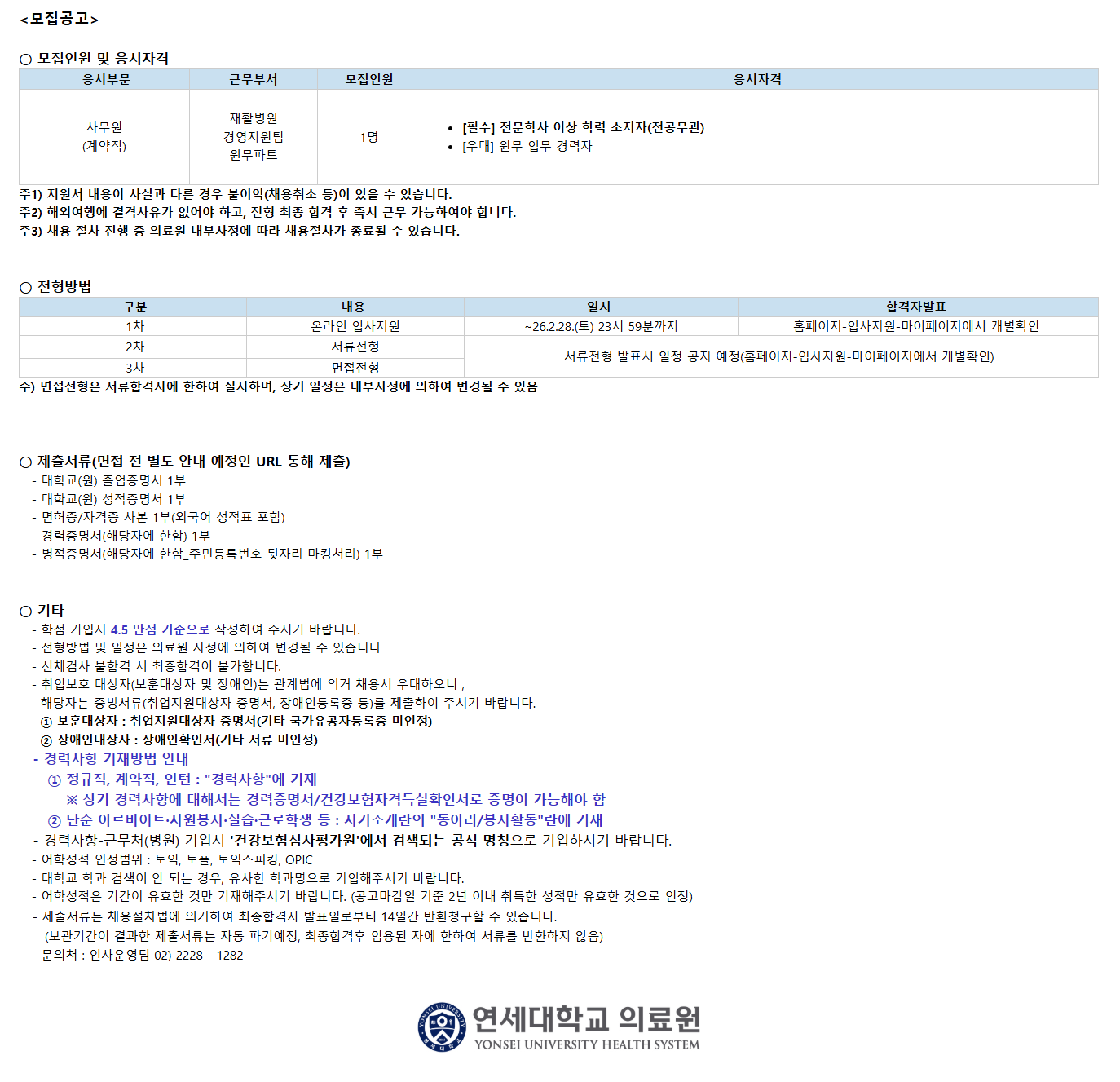 연세대학교 의료원 [일반-신촌] 사무원(계약직) 재활)경영지원팀 원무파트 모집