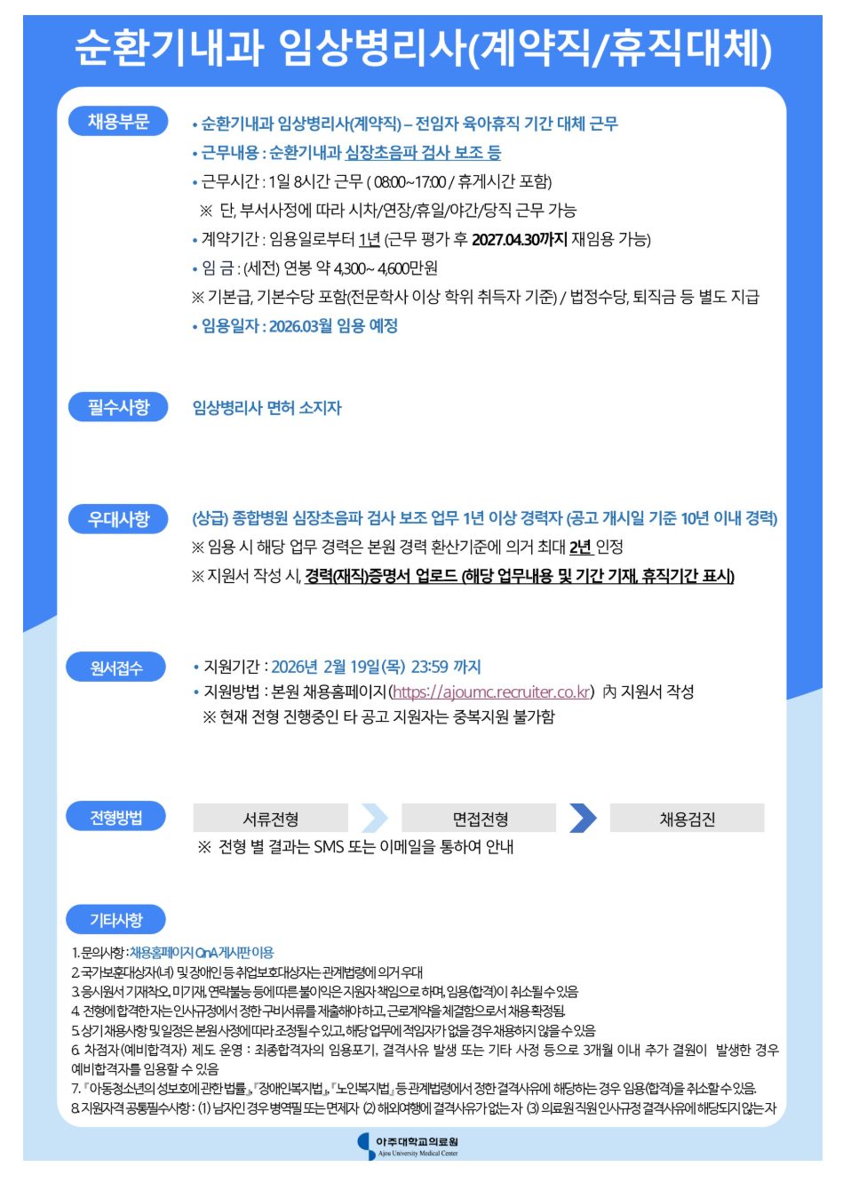 아주대학교의료원 순환기내과(심장초음파) 임상병리사 (계약직/휴직대체)