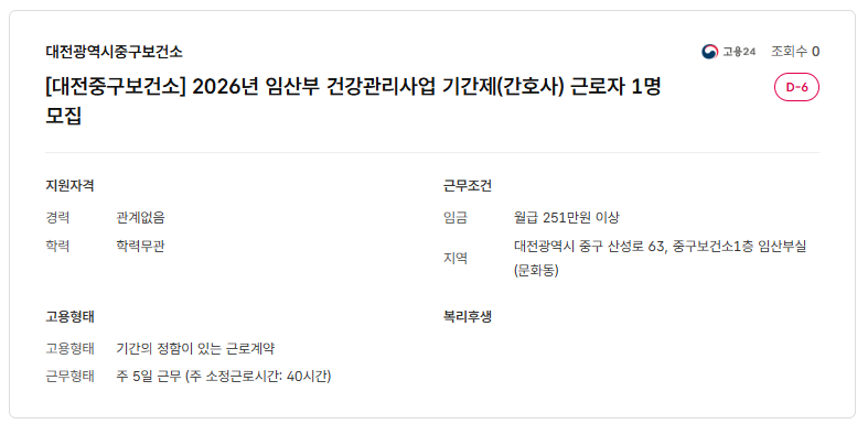 [대전중구보건소] 2026년 임산부 건강관리사업 기간제(간호사) 근로자 1명 모집