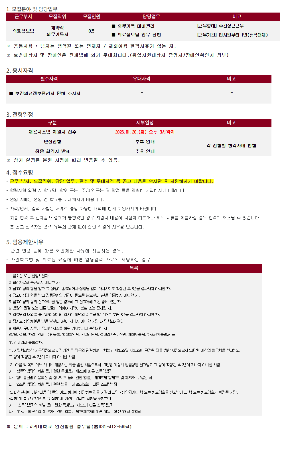고려대부속안산병원 의료정보팀 계약직의무기록사 모집(휴직대체)