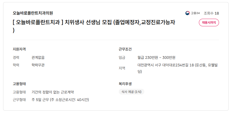 [ 대전 오늘바로플란트치과 ] 치위생사 선생님 모집 (졸업예정자,교정진료가능자 )