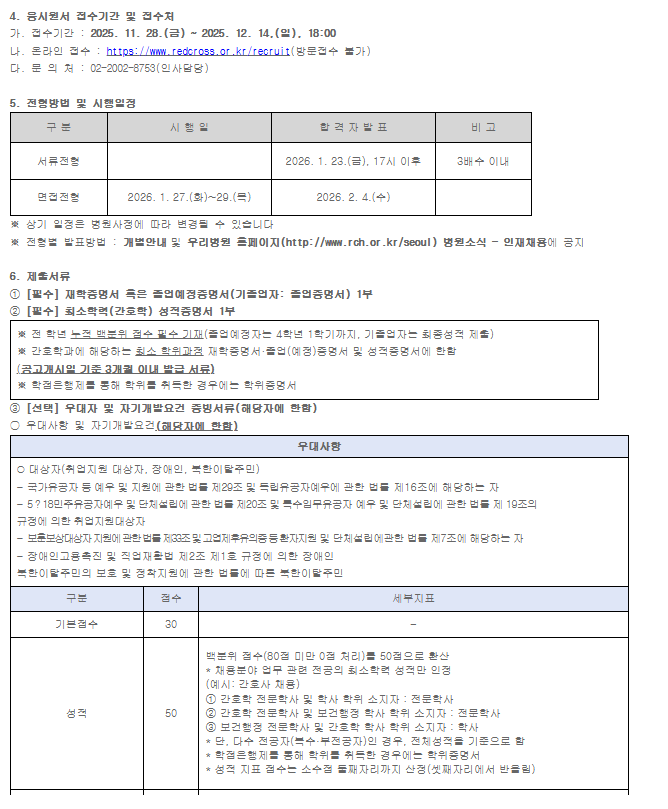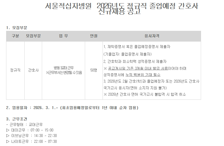 서울적십자병원 2026년도 정규직 졸업예정 간호사 신규채용 공고